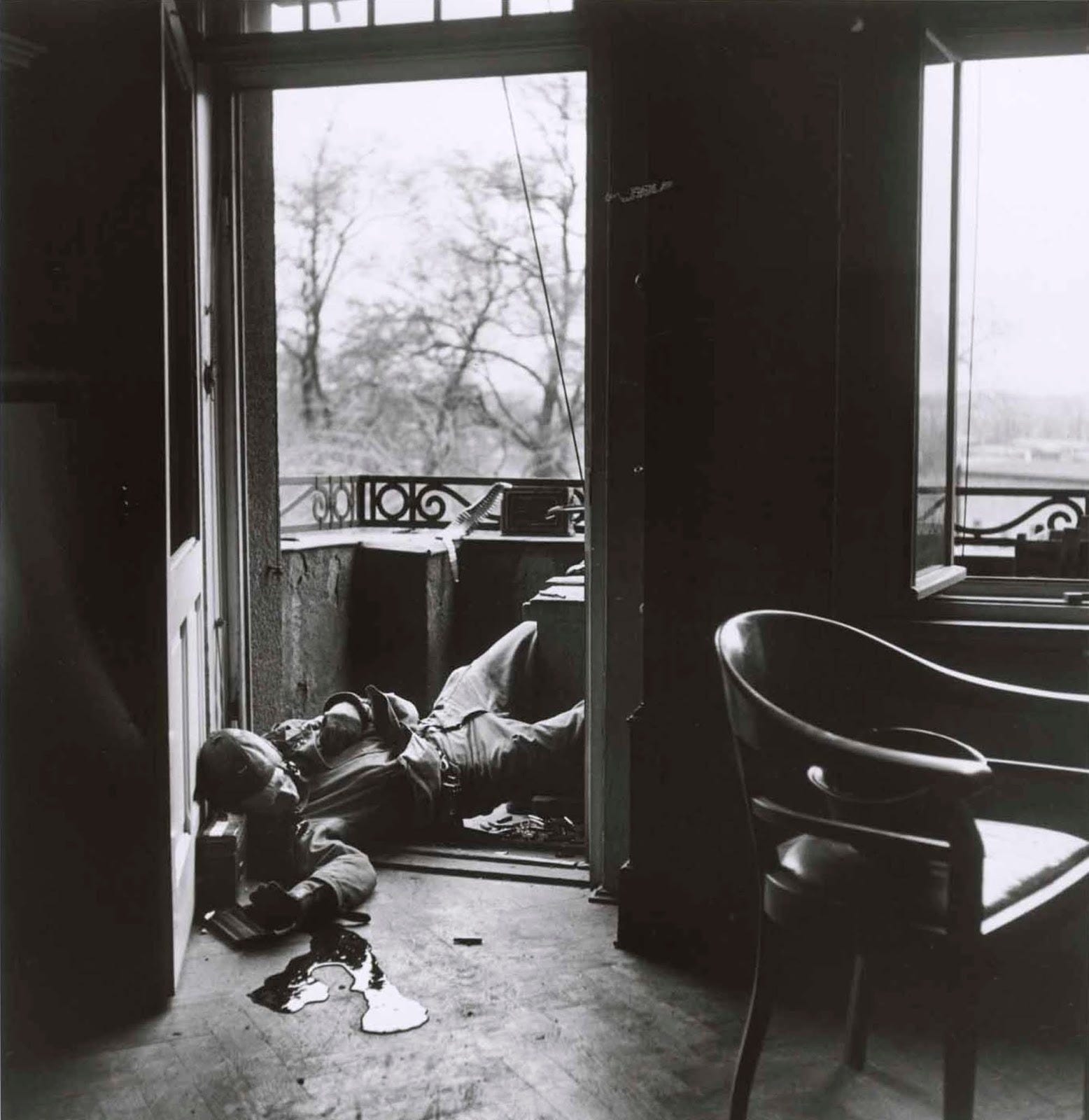 He had been tragically cut down by a German sniper's bullet on April 18, 1945, mere days before the war ended. Despite the photograph's monochrome nature, it vividly conveys the relentless capriciousness of death in war as bloodshed all over the wooden floor. It also portrays the profound sadness that envelops a soldier who had come so close to seeing the end of the conflict, only to have fate intervene tragically.